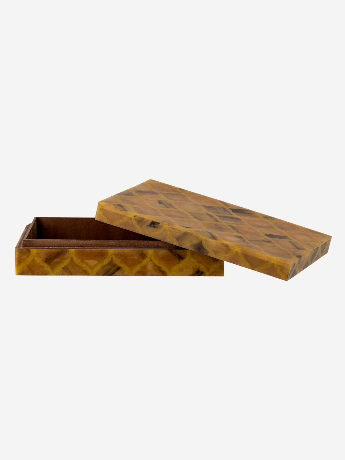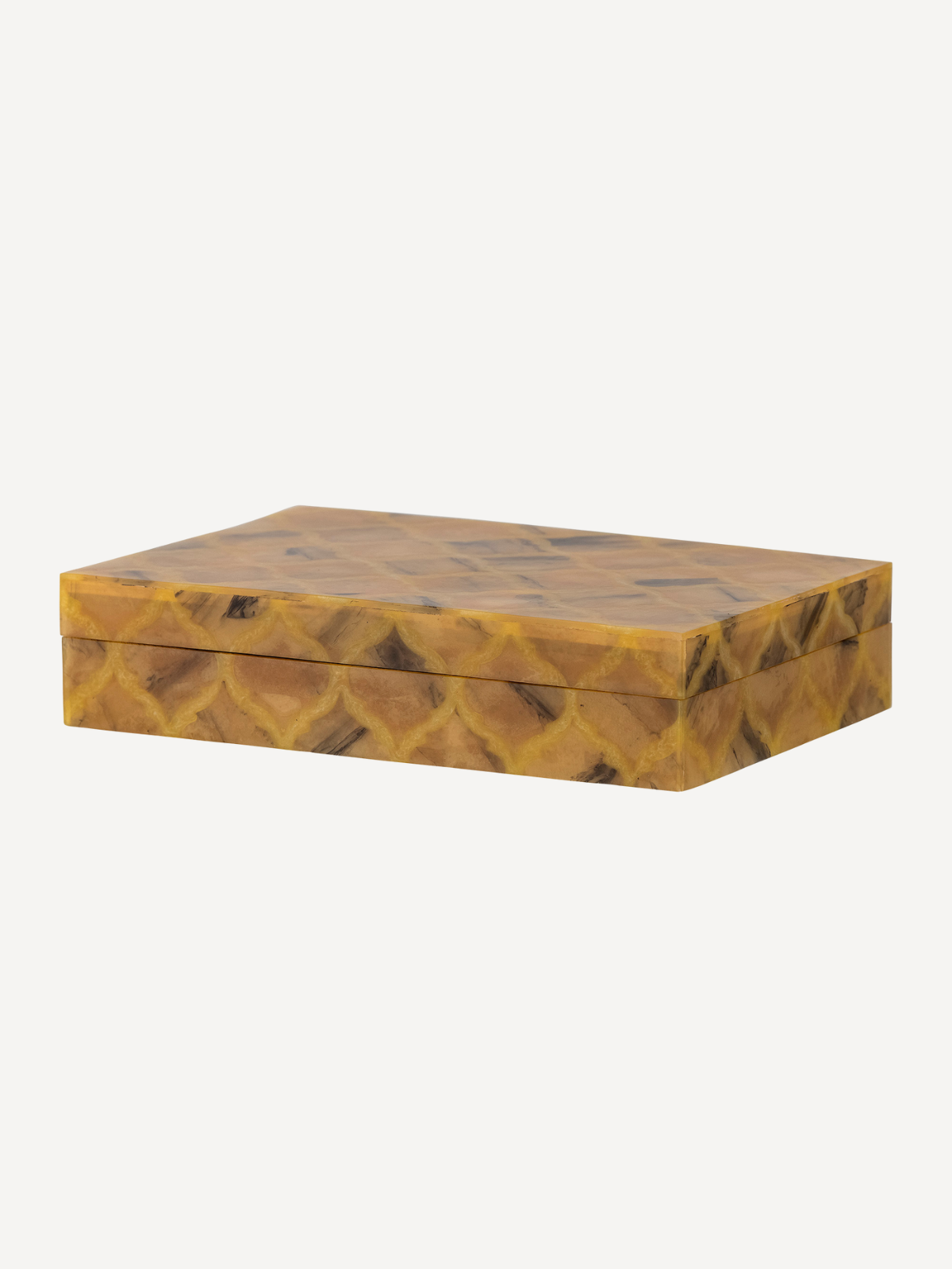 Die Box Limon von Bloomingville ist mit seinem grafischen Muster im Retro-Stil ein besonderes Deko-Accessoire. Sie besteht aus orange-gelben Resin Harz, hat eine glatte Oberfläche und ist innen mit Holz verkleidet. Die Box hat einen Deckel und kann daher zur Aufbewahrung von Kleinigkeiten genutzt werden oder einfach als dekoratives Element.