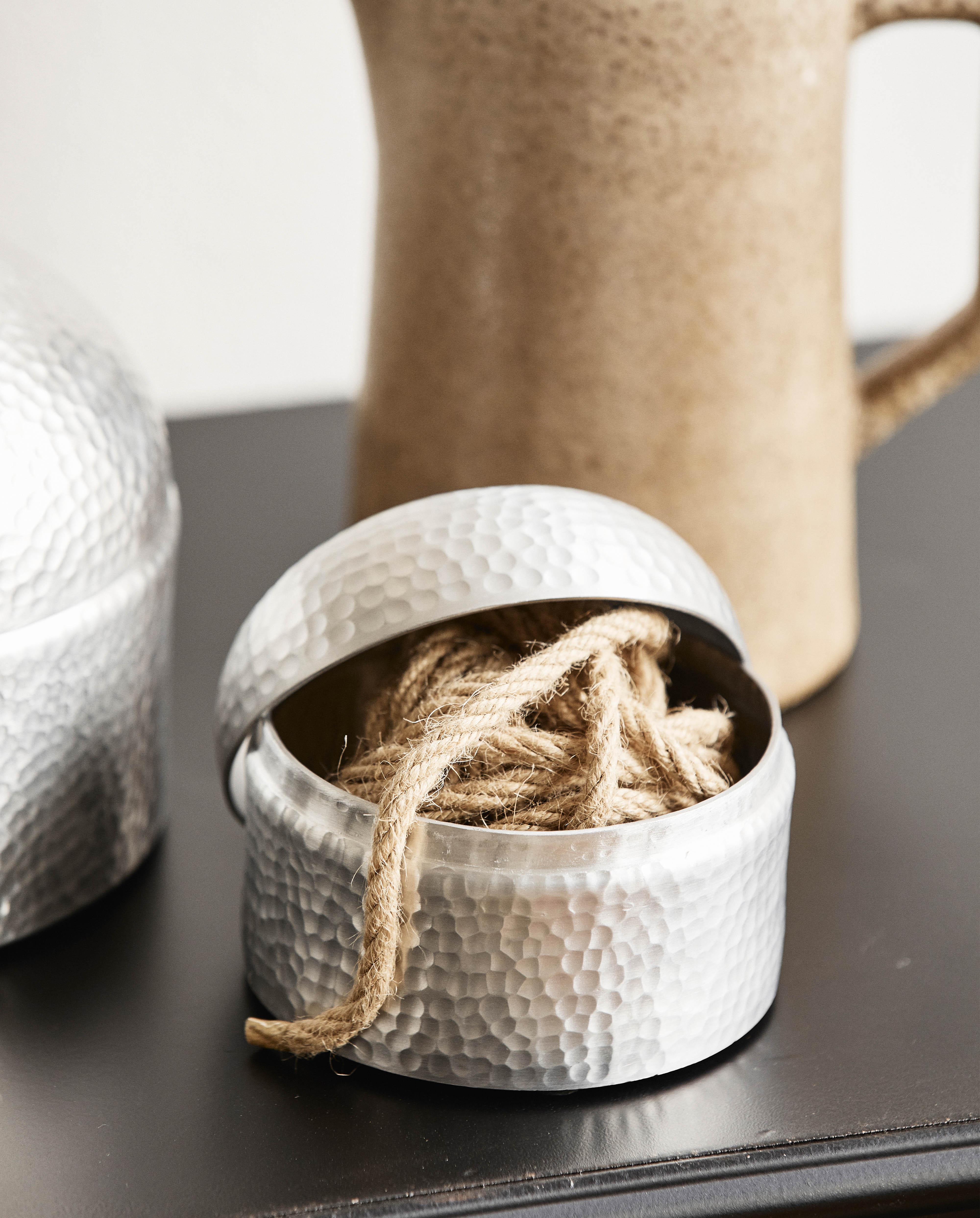 Das Macau Aufbewahrungsgefäß mit Deckel besteht aus Aluminium. Das MACAU Aufbewahrungsgefäß hat eine gehämmerte Oberfläche, die sich von anderen glatten Oberflächen abhebt und deiner Einrichtung eine exklusive Note verleiht.