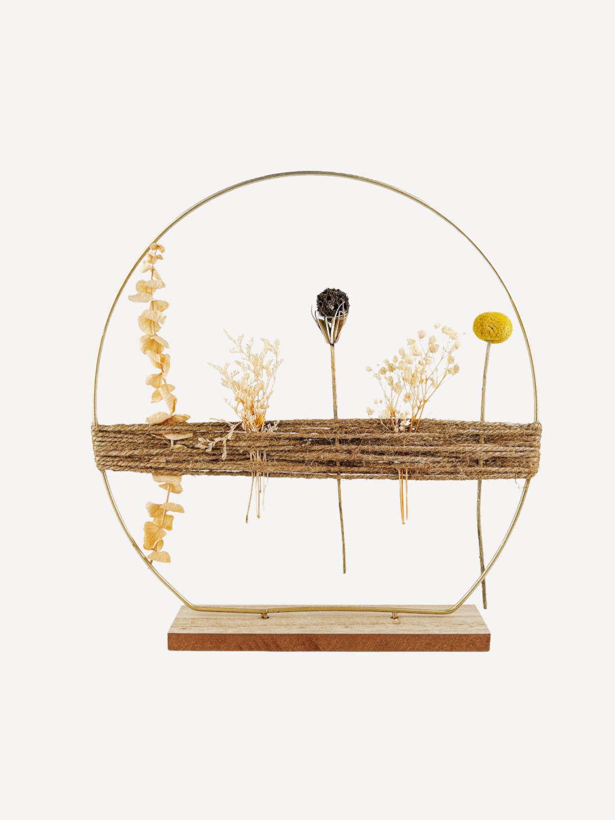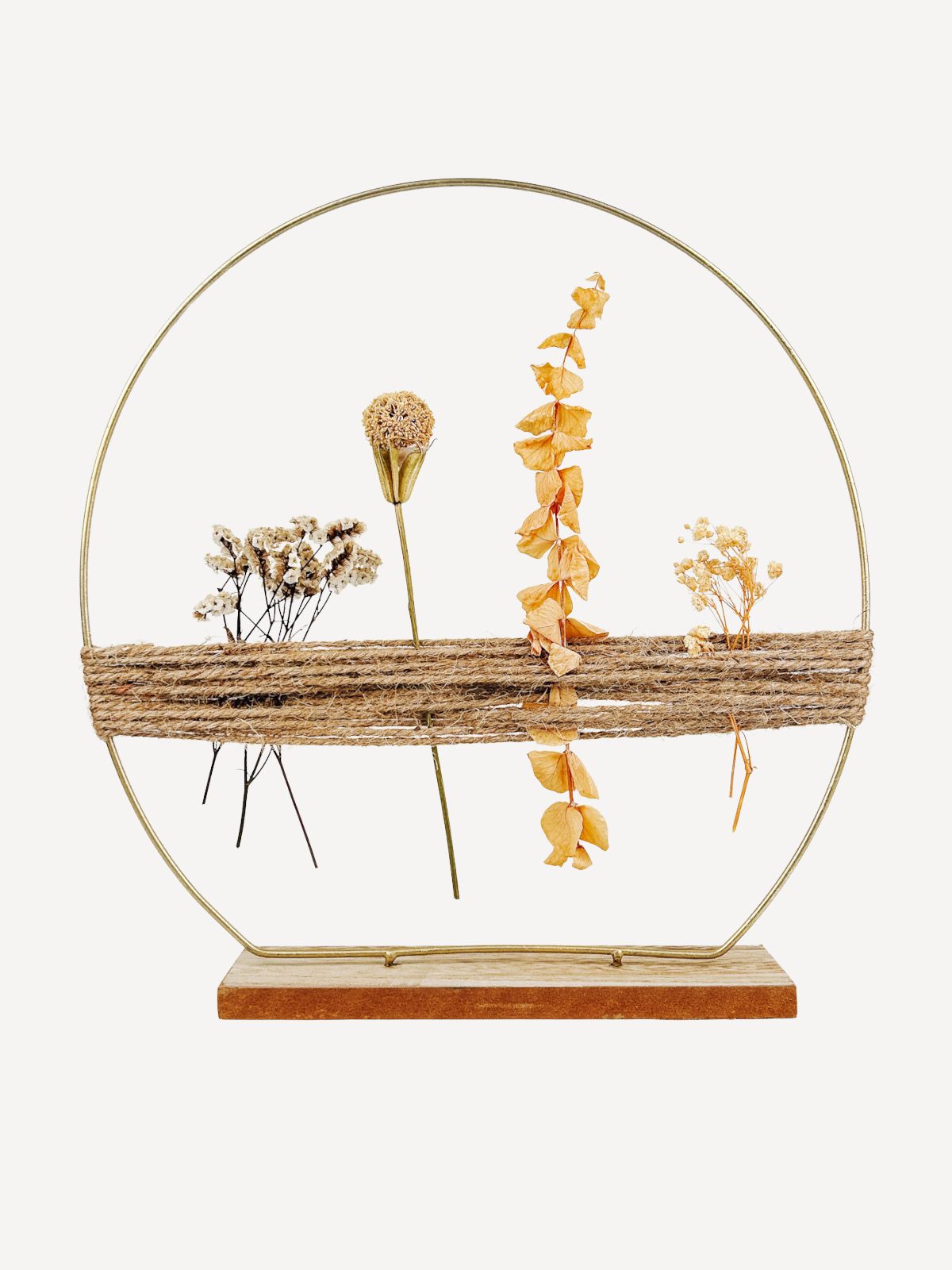Dekoaufsteller Felizia von Boltze Home. Der Aufsteller besteht aus einem Pappelholzgestell und einem Metallring. In diesen sind verschiedene Trocken-Blumen, eine Kombination aus Hortensien und