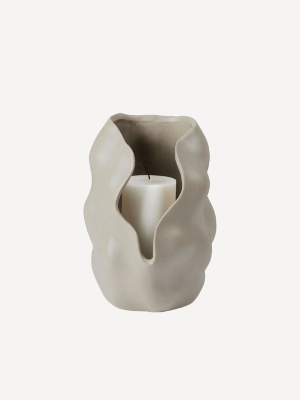 Das wunderschöne Windlicht Hekla Hurricane besteht aus Steingut mit matter Glasur. Mit seiner organischen Form und der Farbe Dove Grey ist sie ein echter Hingucker in jeder Wohnung.