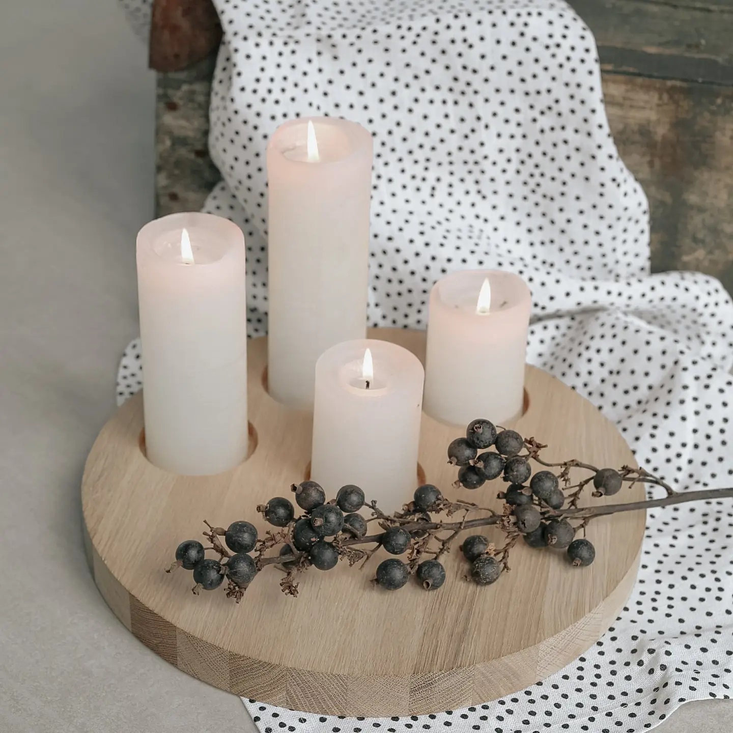 Ideal als Adventskranz für Blockkerzen-Liebhaber und perfekt für ganzjährige Nutzung. Dekoriere es auf deinem Esstisch oder deiner Lieblingskommode – dieses stilvolle Kerzenbrett wird garantiert zum Blickfang in deinem Zuhause.