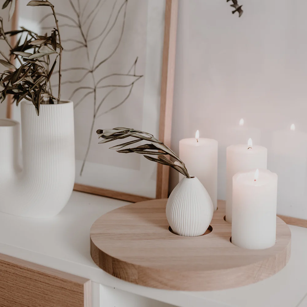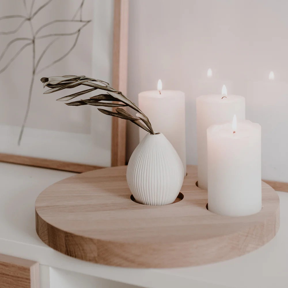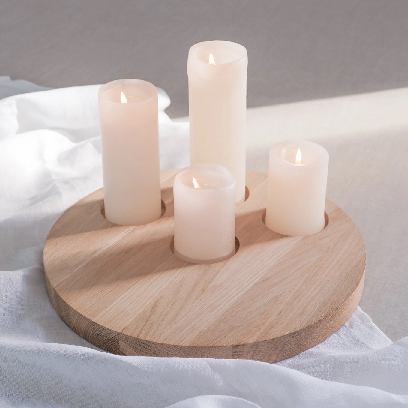Entdecke das runde Kerzenbrett aus wunderschönem Eichenholz von Eulenschnitt. Mit einem Durchmesser von 32 cm und einer Höhe von 3 cm bietet es Platz für 4 Blockkerzen und schafft eine gemütliche Atmosphäre in jedem Raum.