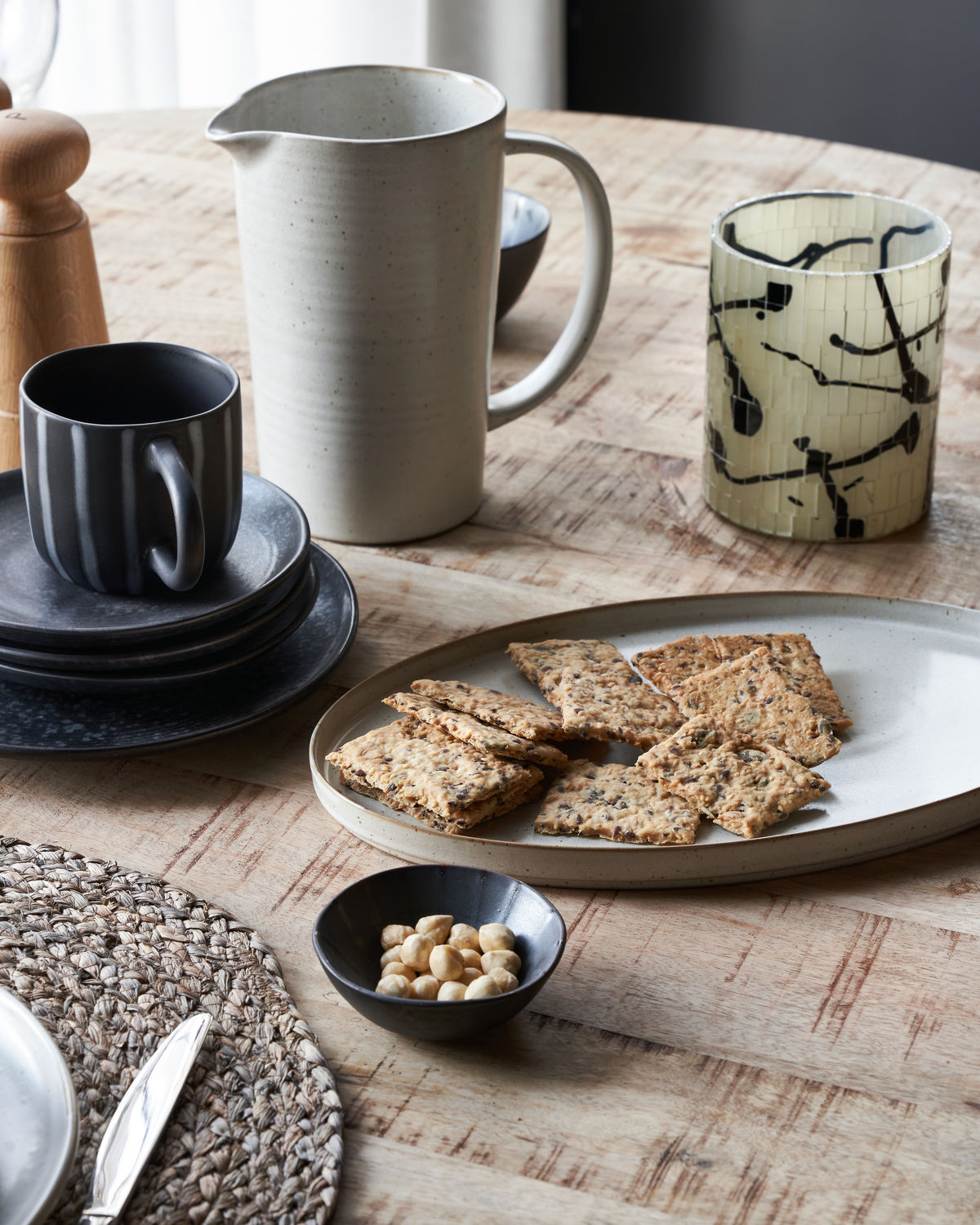 Rahmen und heben Sie Ihr Essen mit dieser ovalen Servierplatte namens Pion hervor. Auf diesem lässigen Design aus Steinzeug mit weißer, gesprenkelter Glasur passt alles, vom Salat über gebratenes Gemüse bis hin zu Kuchenstücken. Halten Sie den Tisch mit alltäglichen Gläsern und weißen Servietten hell gedeckt. Bodenständig, aber immer mit Liebe zum Detail. Aufgrund der matten Textur der Glasur kann es im Laufe der Zeit zu Kratzern kommen, wenn Sie Ihren Pion-Artikel verwenden. Dies trägt einfach zum Charme und der robusten Ausstrahlung des Designs bei.