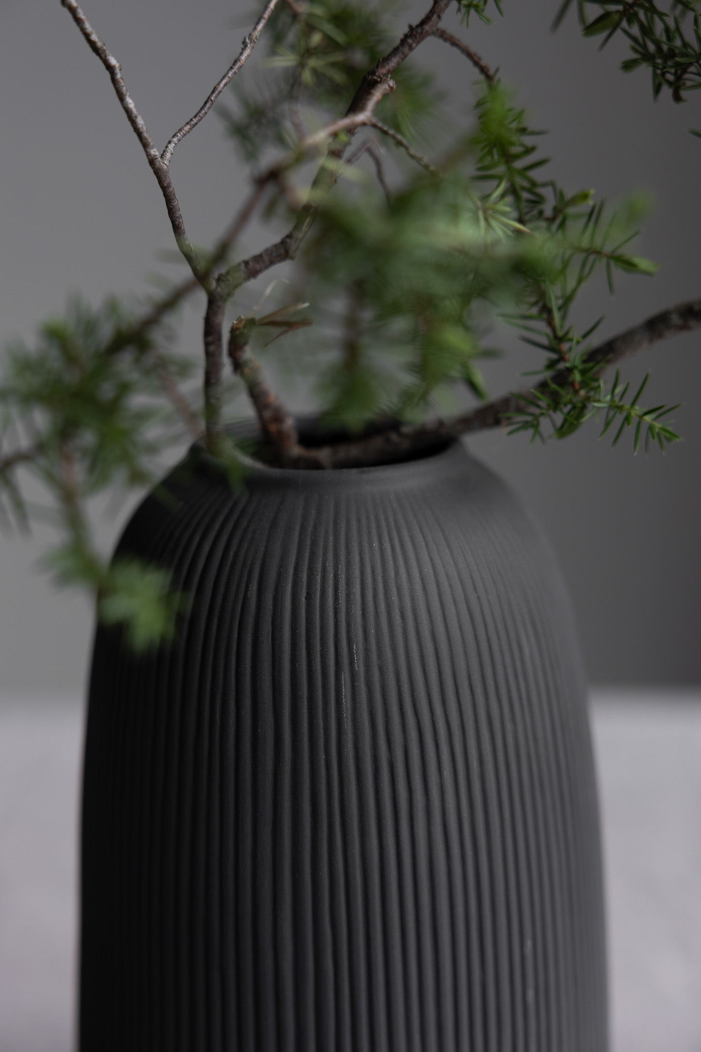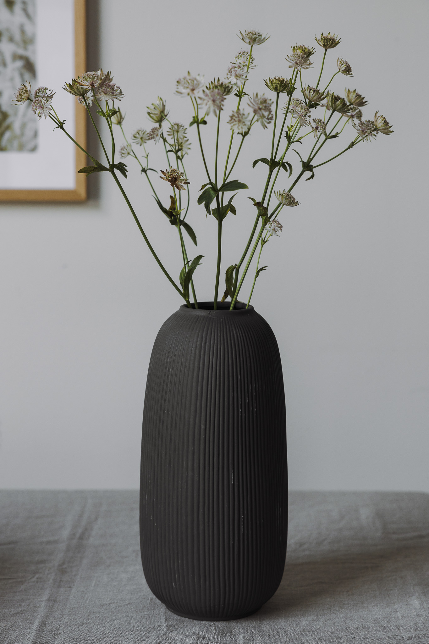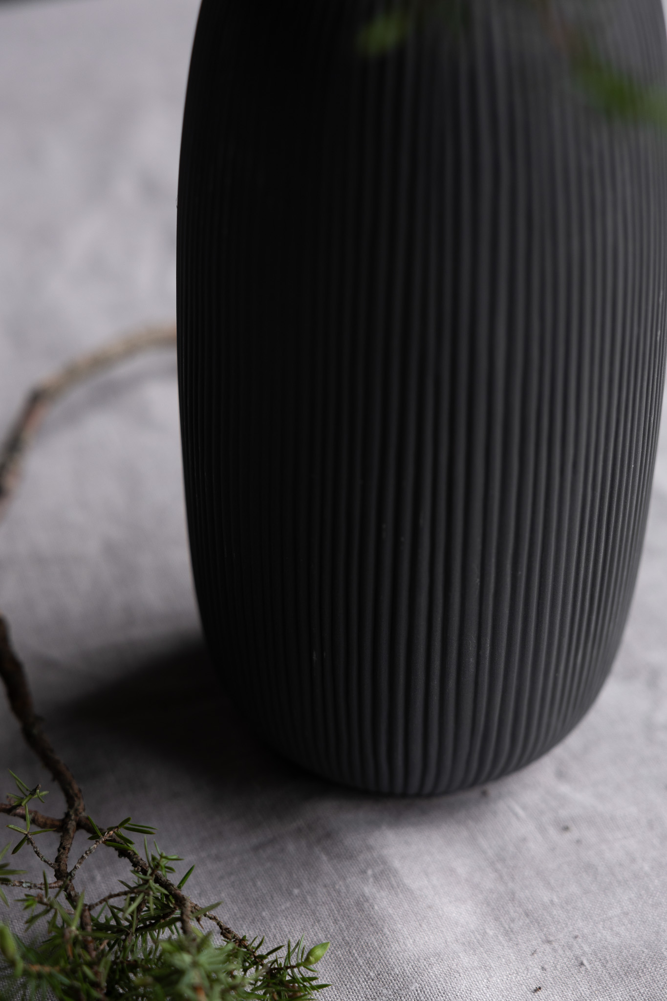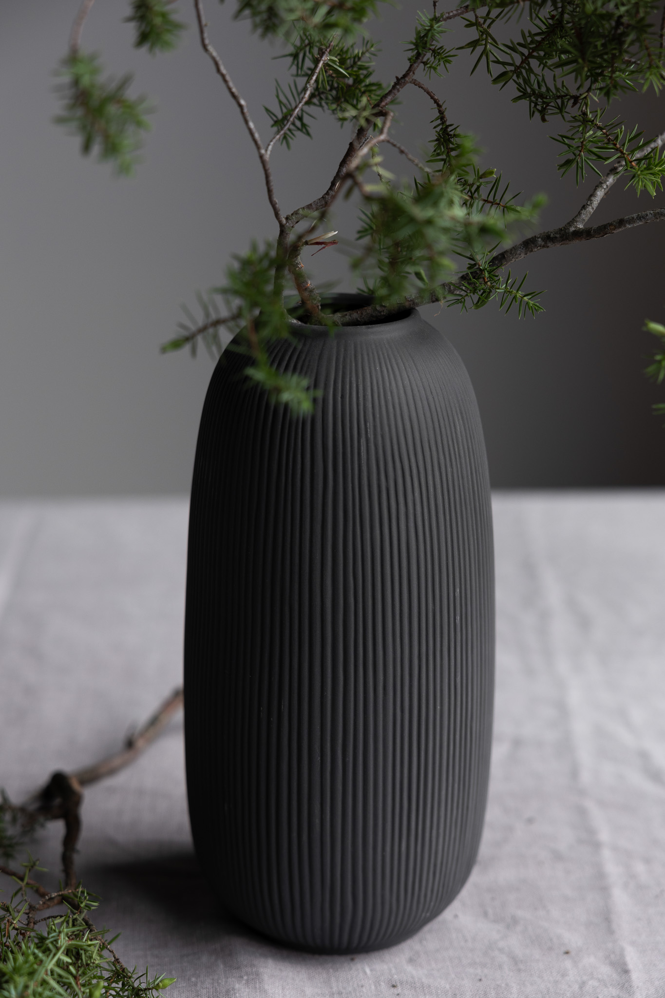 Die hohe Keramikvase Åby mit zarten, vertikalen Rillen entlang der Oberfläche besticht durch ihre schlichte Schönheit. Sie ist eine wunderbare Ergänzung für jedes Zuhause, ob mit einem Sommerstrauß, einigen eleganten Trockenhalmen oder einem Zweig im Winter dekoriert. Die Vase wirkt sowohl allein als auch in Kombination mit Produkten der Ekenäs- und Källa-Serie besonders schön.