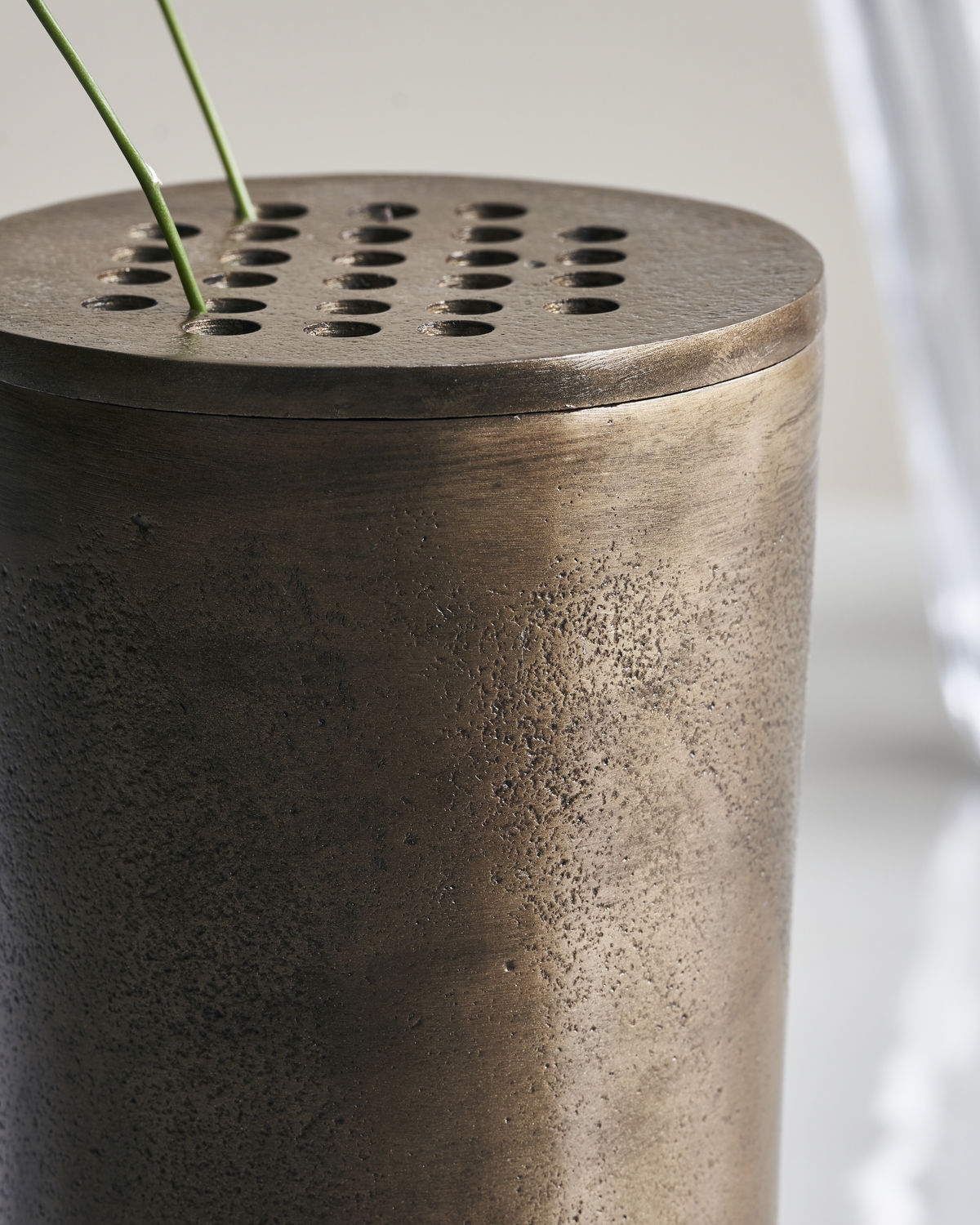 einem dezenten Messing-Ton sorgt für Glanz, während die Löcher die Vase