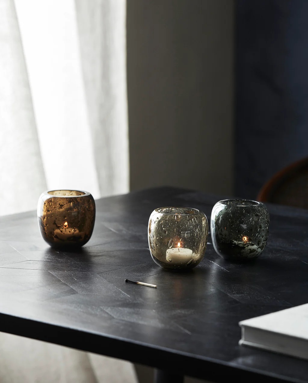 Theo ist für Teelichter oder kleine Stumpenkerzen geeignet. Die Oberfläche des Glases ist mit einem Bobble-Effekt versehen, der ein Teil des Designs ist.